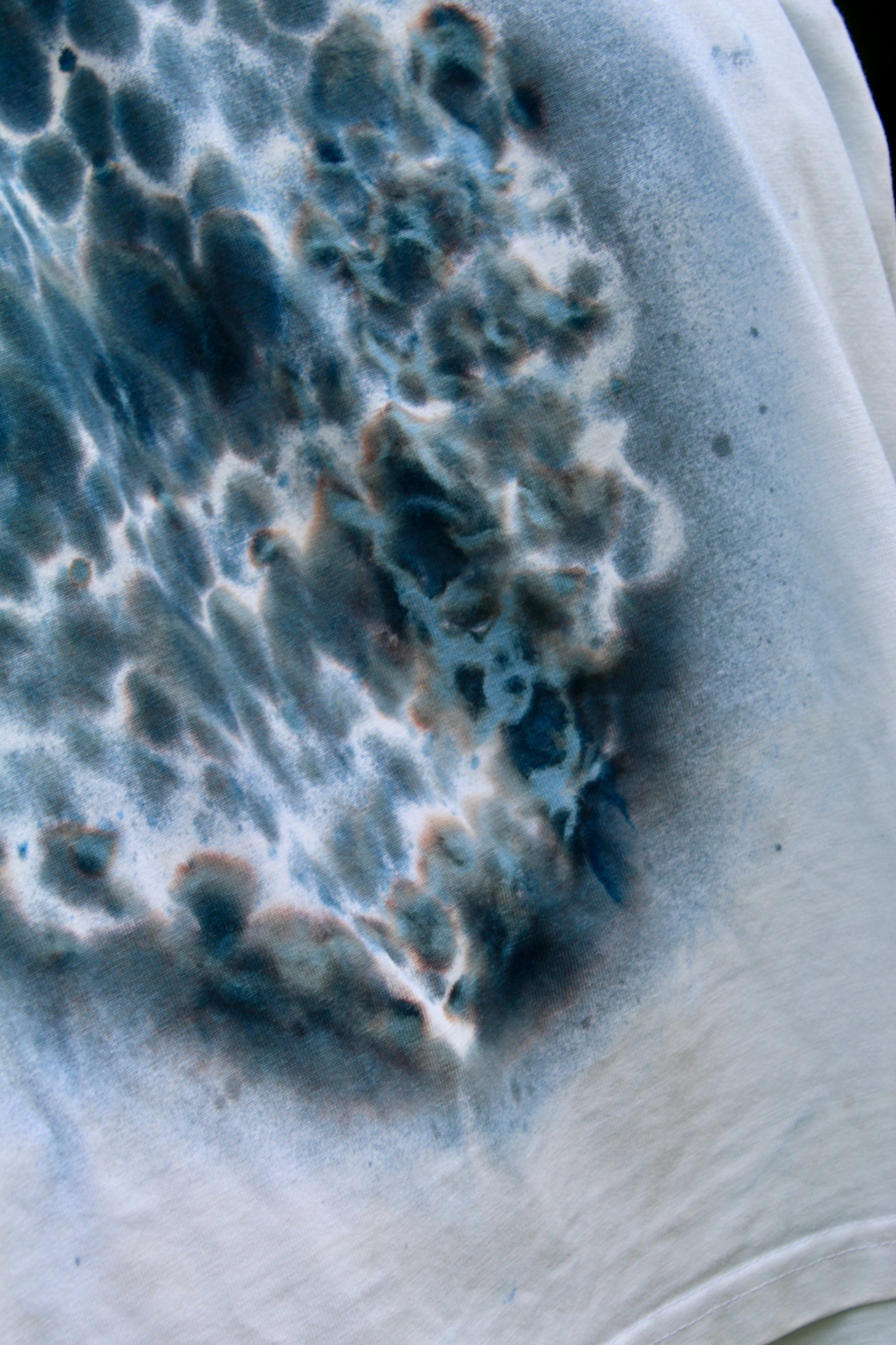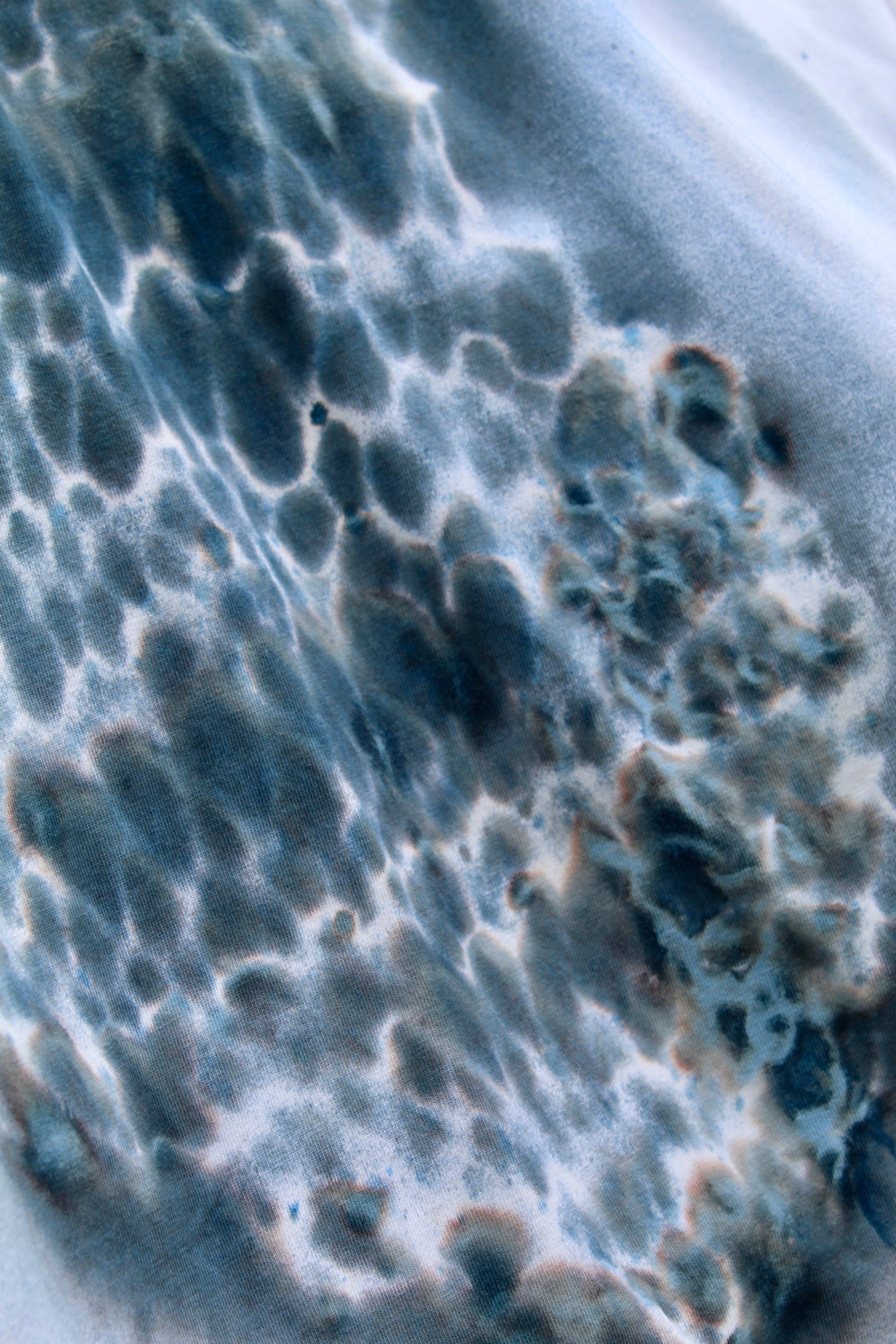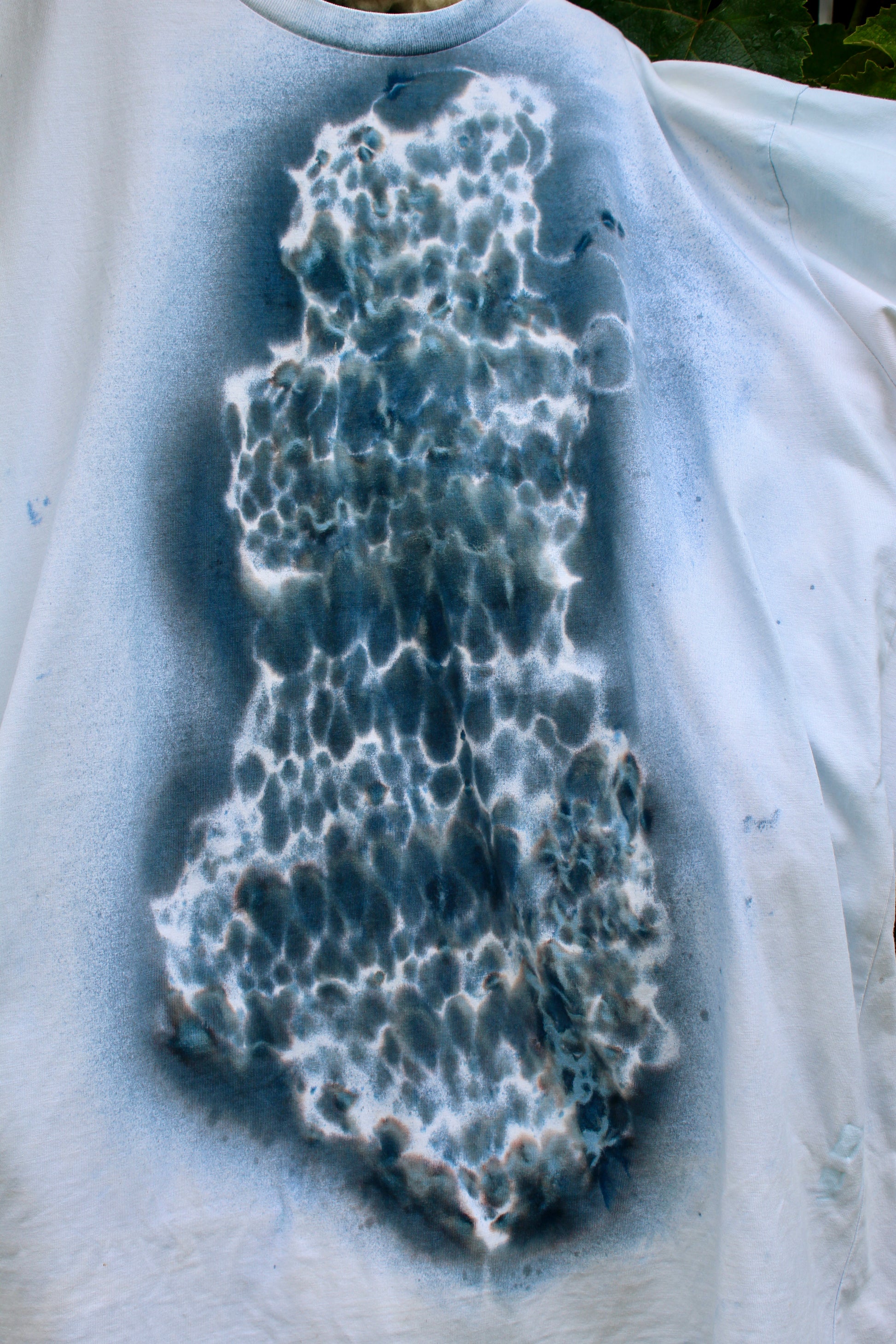 Solar dyed print on medium weight cotton t-shirt. Created with a dye that develops in the sunlight, leaving behind traces of materials used in the ‘Delicacy’ collection. This tee features the echo of knitted wool.