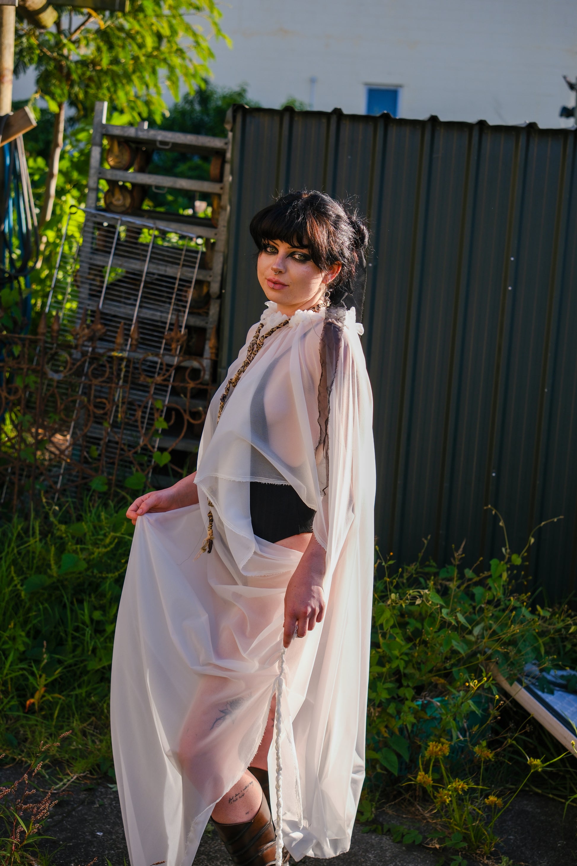 The Cassandra Dress is a one size fits all sheer piece featuring a ruffle neck signature to this collection. Sheer, flowing and weightless.