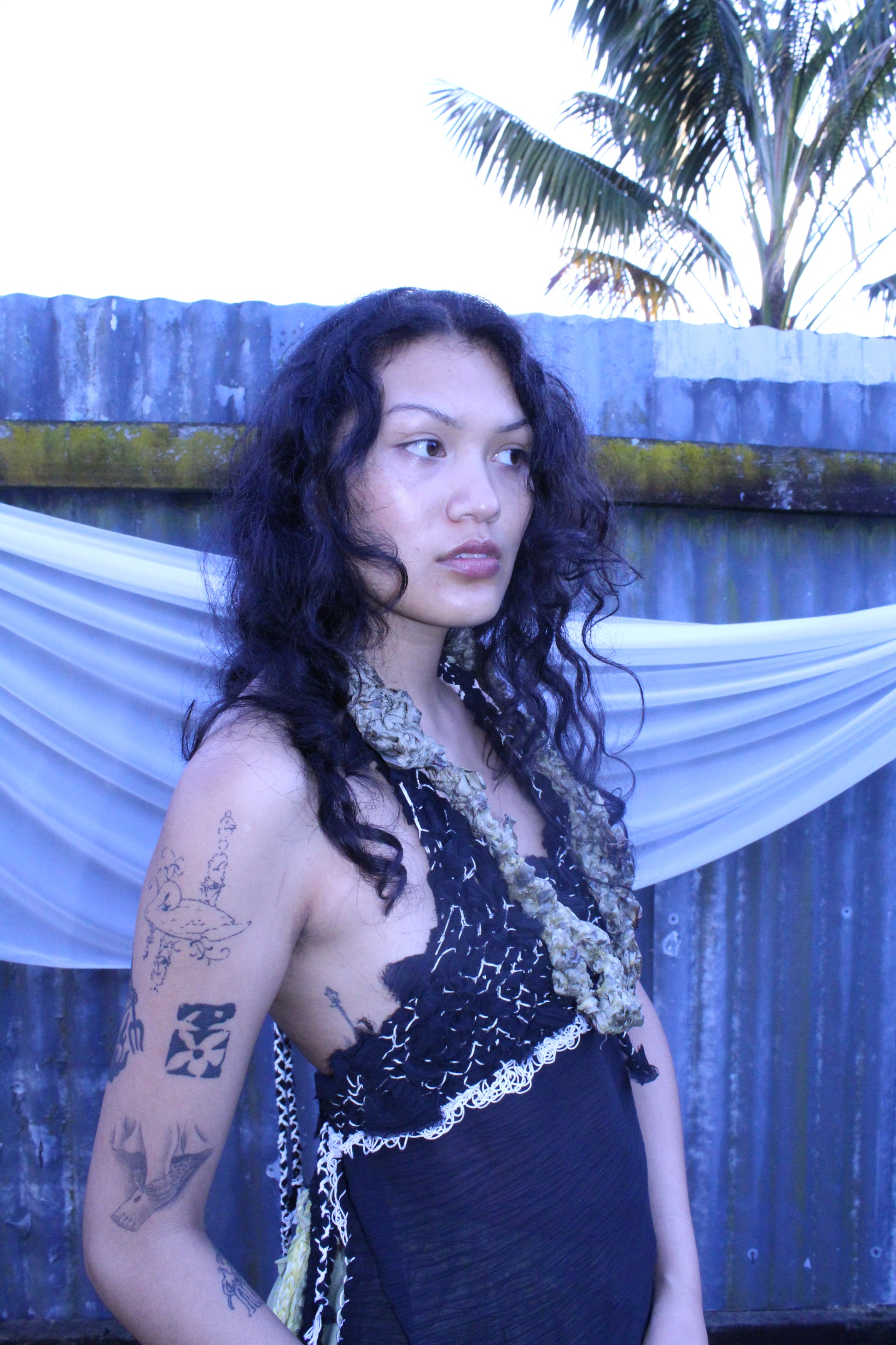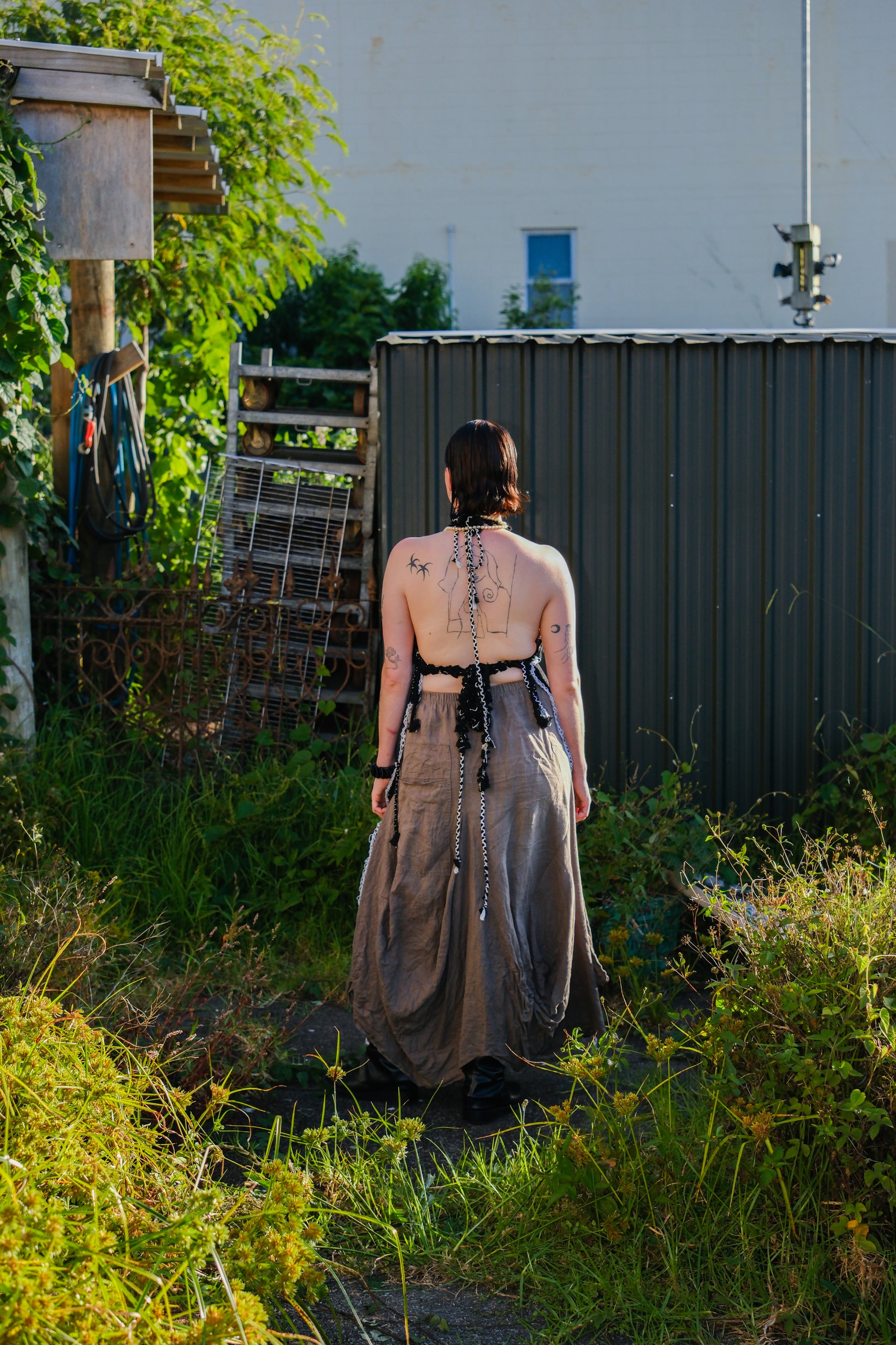 The Caviar Apron Dress is a gorgeously versatile piece created from secondhand materials, featuring a knitted bra, halter with braids and a cotton knitted trim. Layer over skirts, pants or dresses.