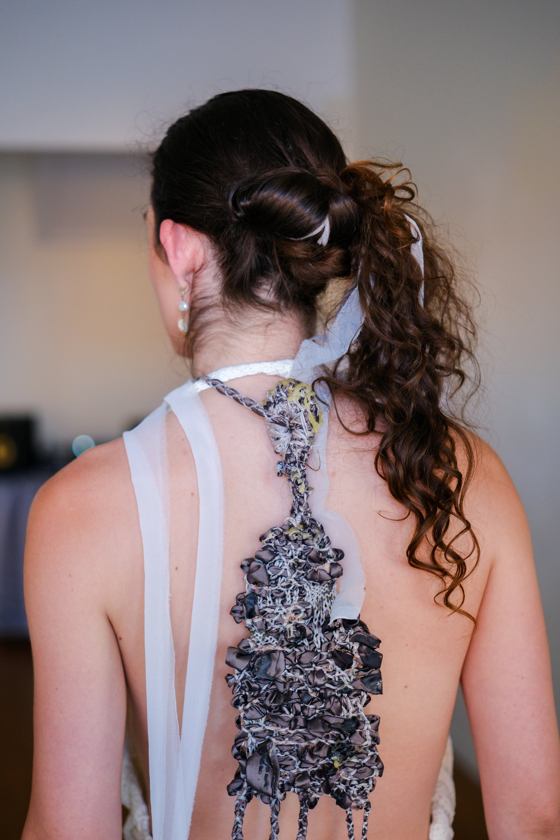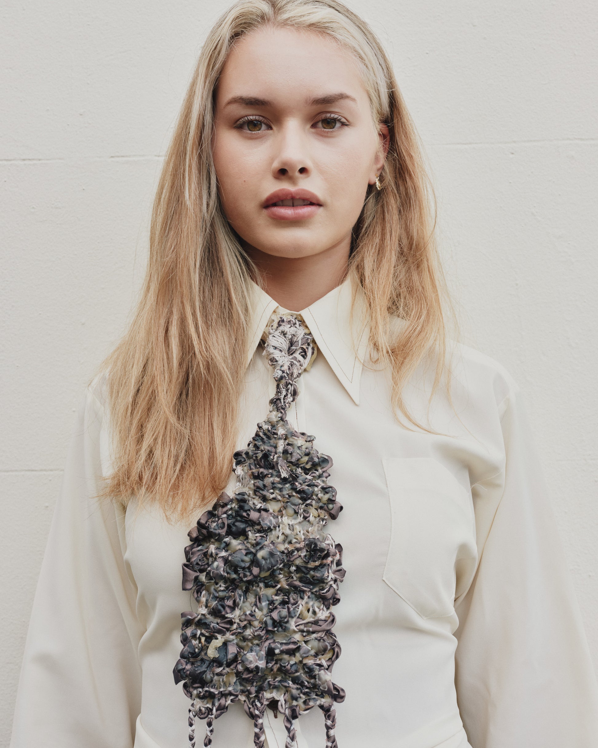 A one of one sculptural necklace created from knitted and braided satin and cotton, with edges burnt in beeswax and a metal clasp.
